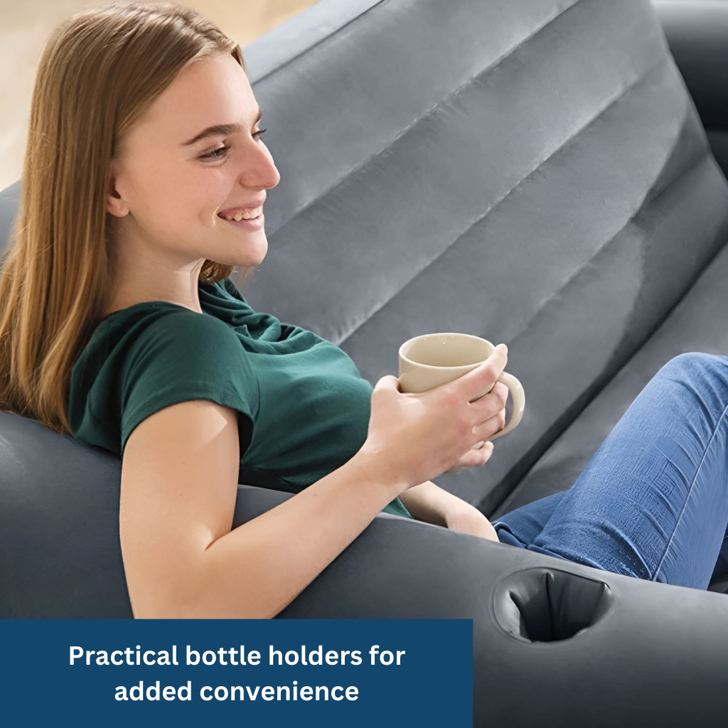 The sturdy backrest and integrated armrests with cup holders provide extra luxury, while the velvety surface ensures a comfortable lying experience.