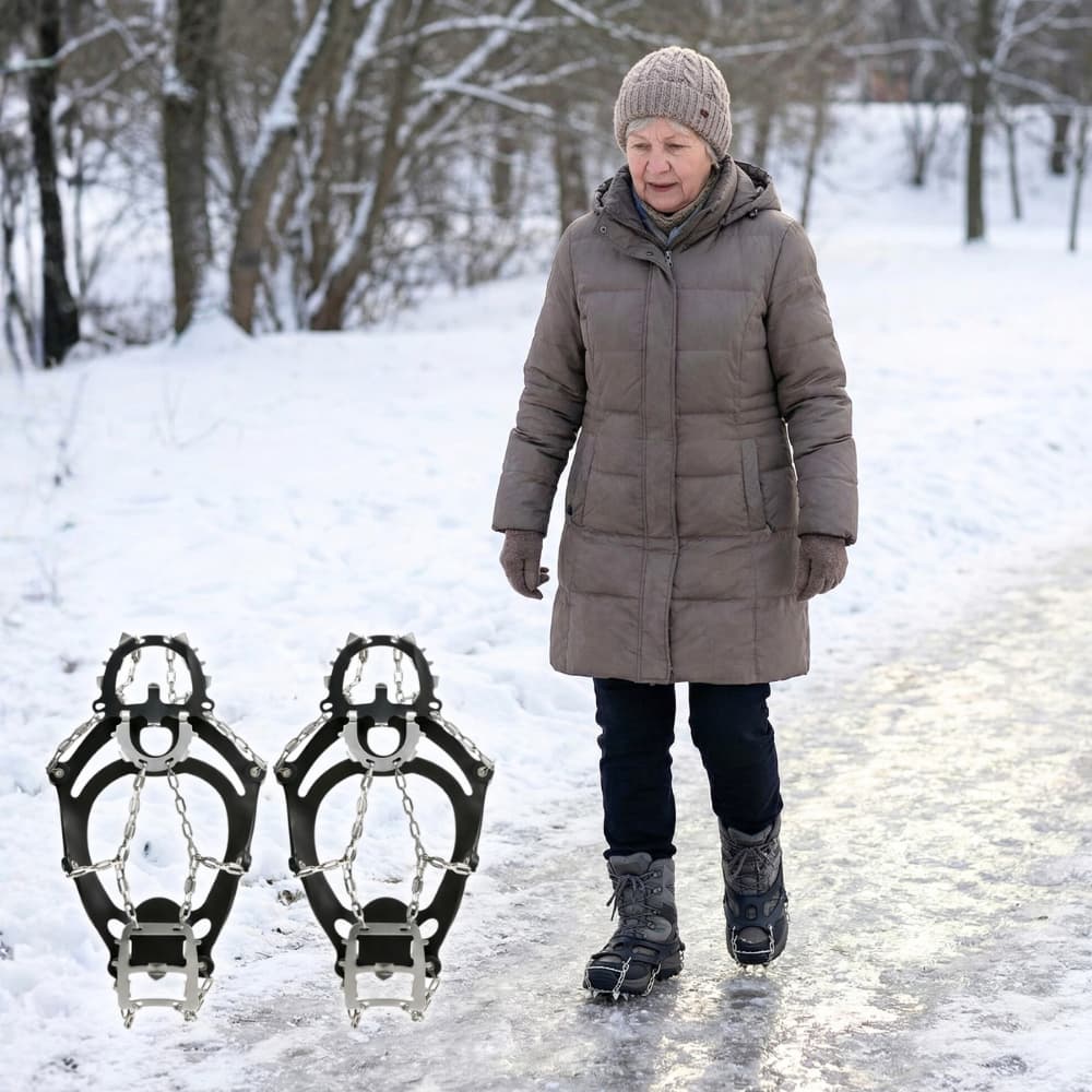 The NaturVibes crampons provide secure traction on ice, snow, mud, wet grass, and slippery trails.