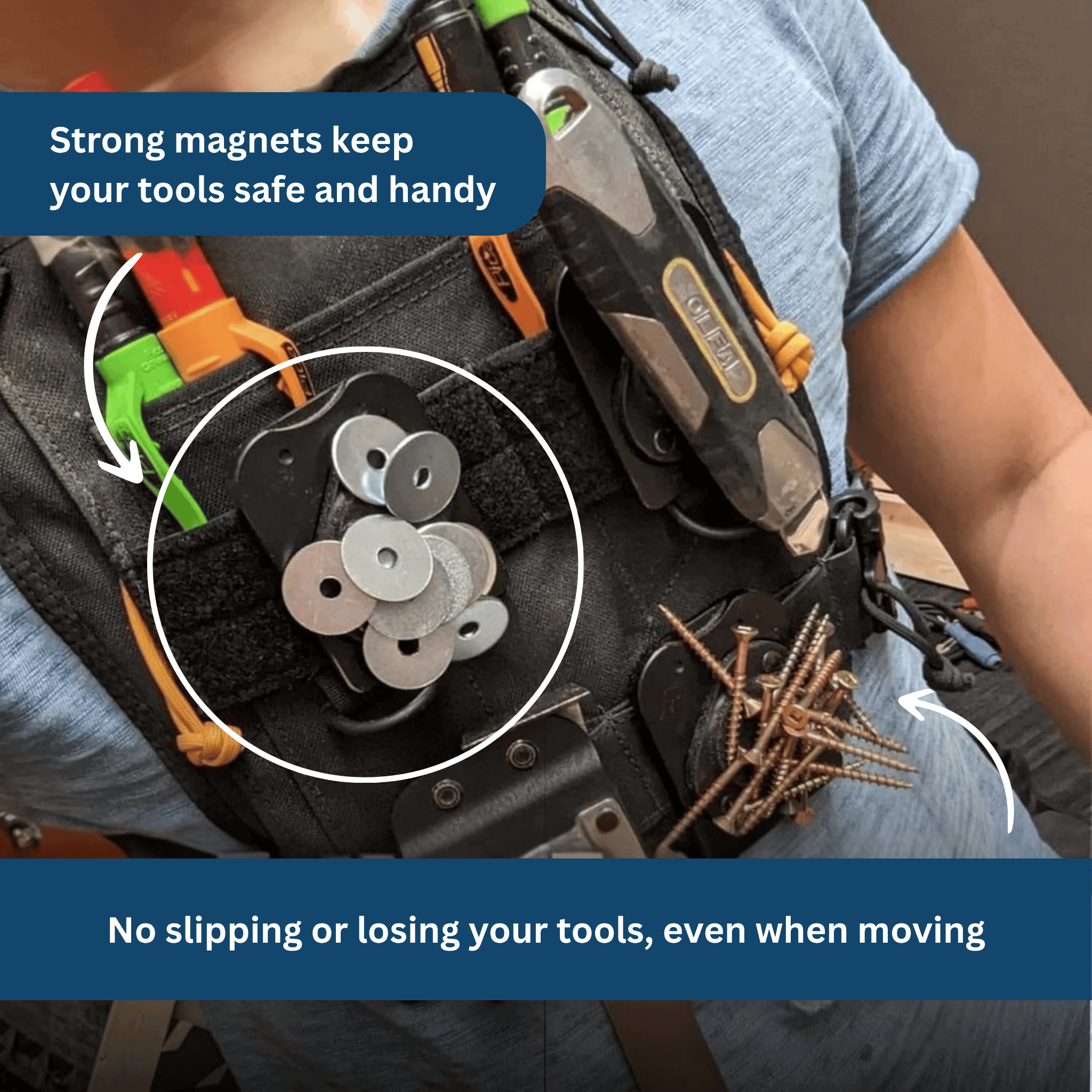 This keeps your hands free while allowing you to quickly grab or switch tools whenever needed.