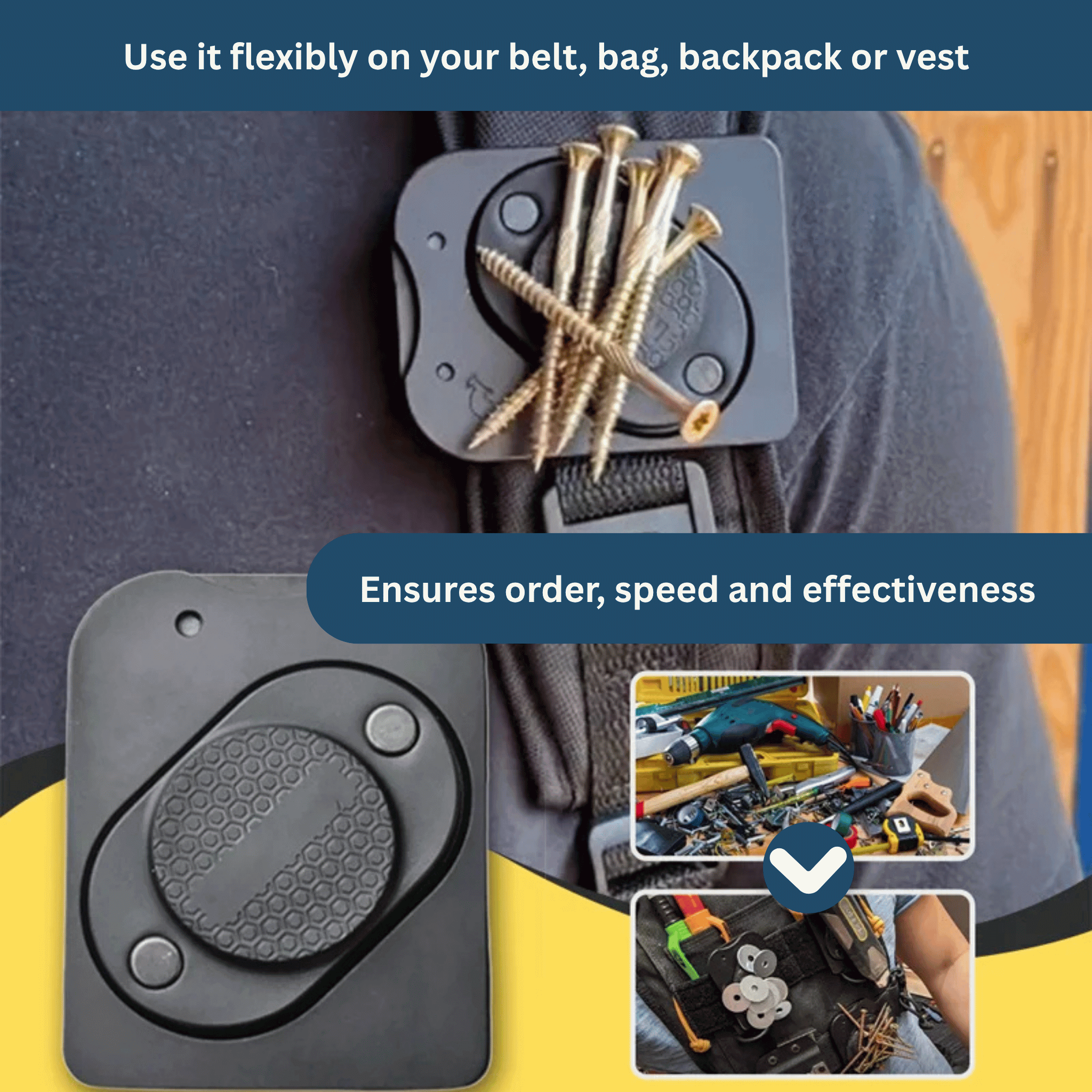 The tool holder features extra-strong magnets that securely hold tools such as screwdrivers, pliers, nails, or even hammers.