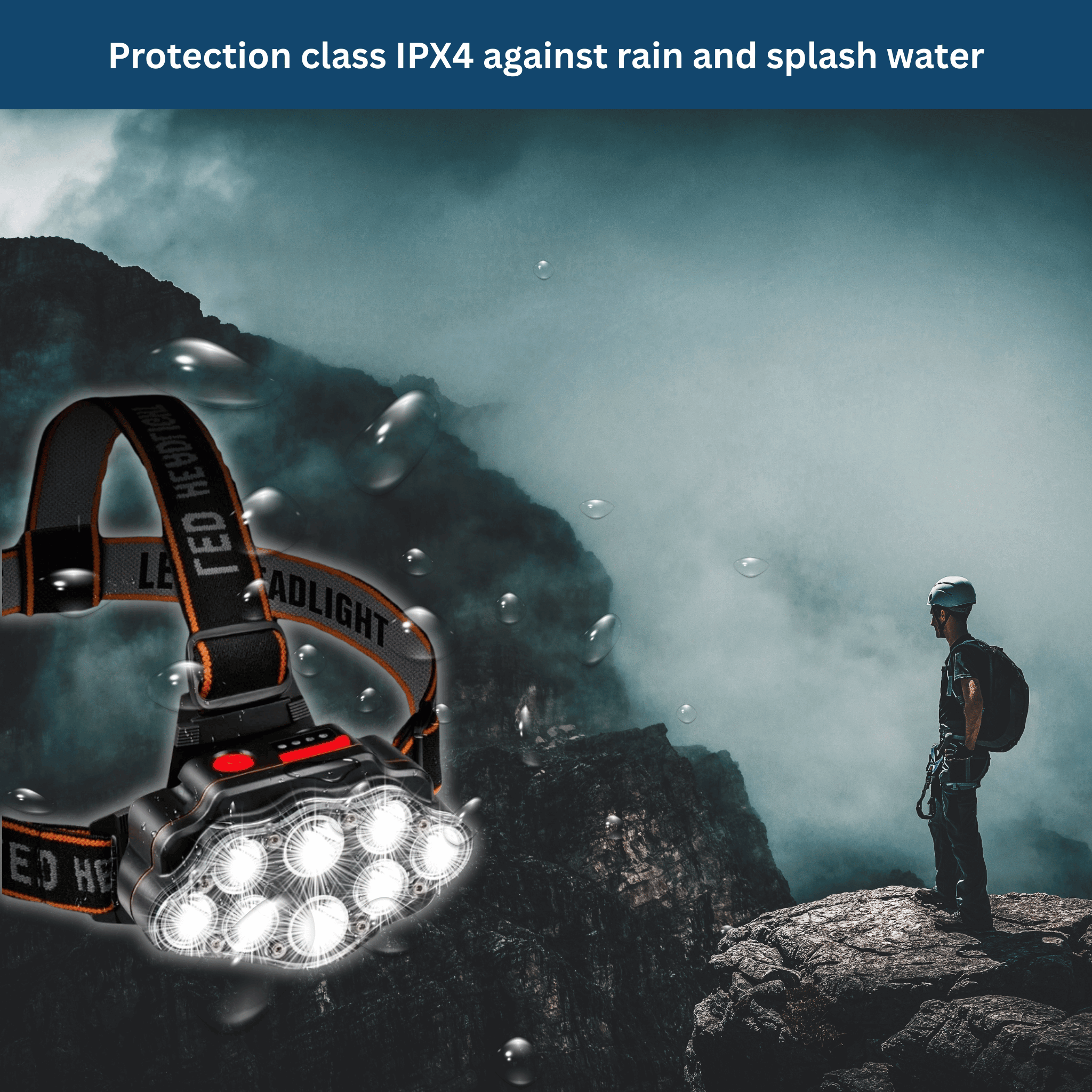 With IPX4 protection, the headlamp is shielded against rain and splash water.