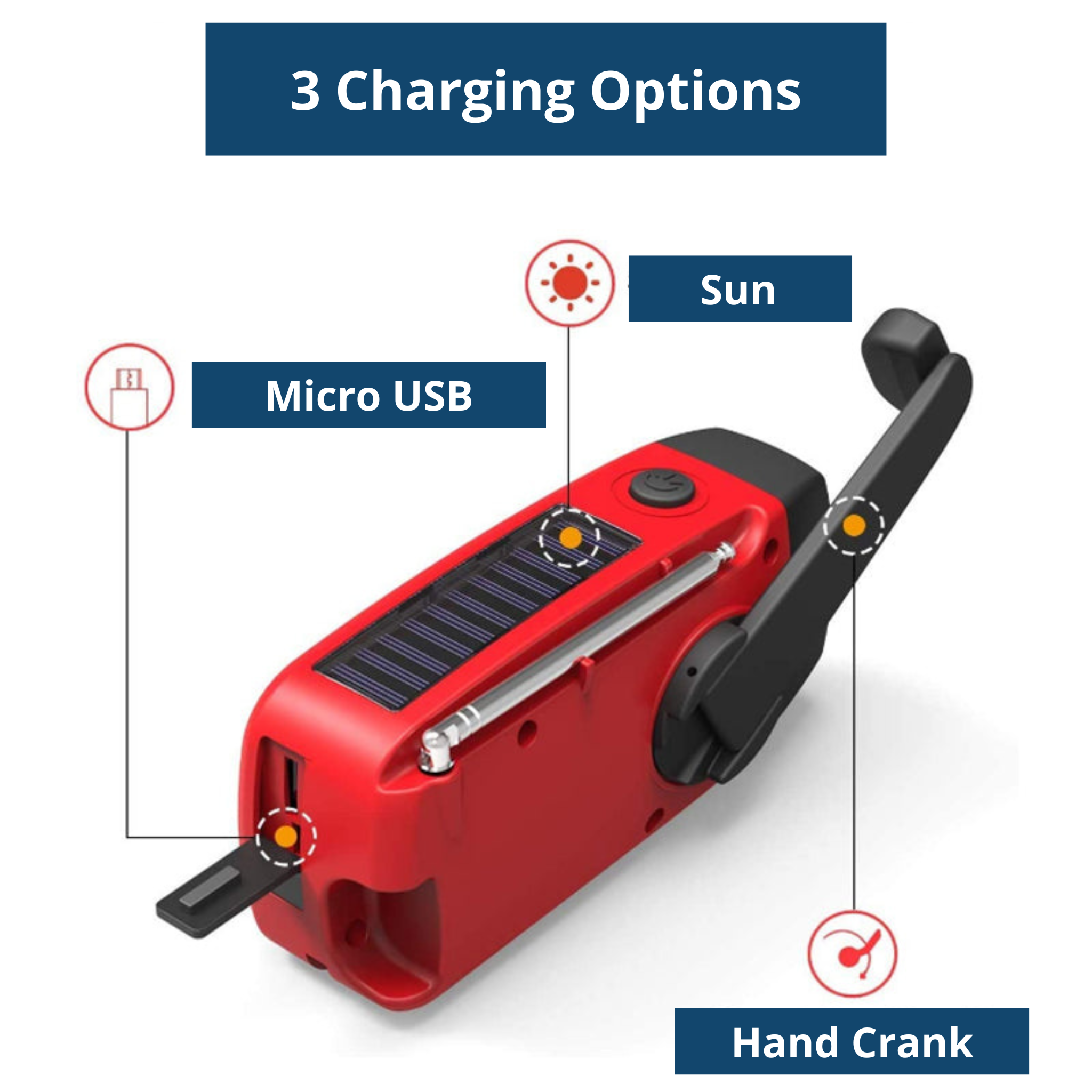 - Built-in hand crank