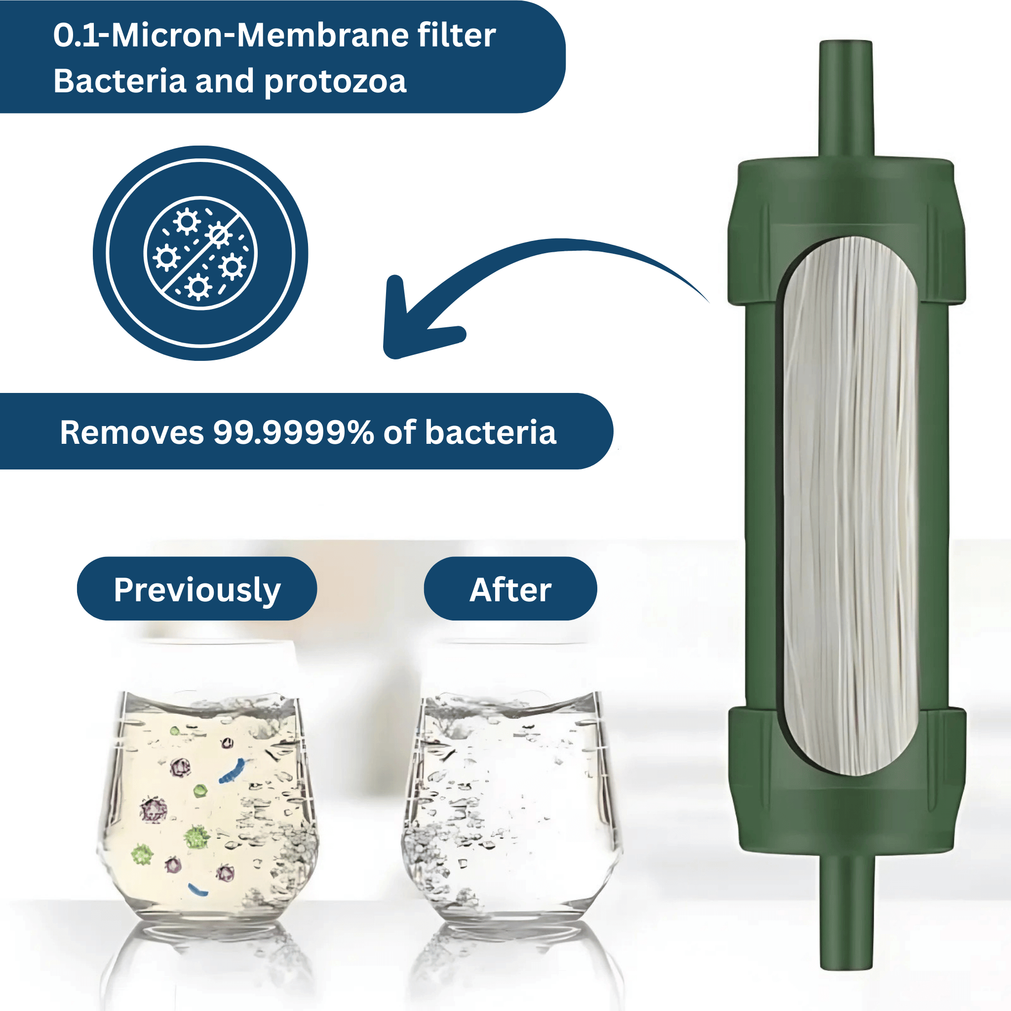 The built-in 0.1-micron membrane reliably filters bacteria and protozoa.