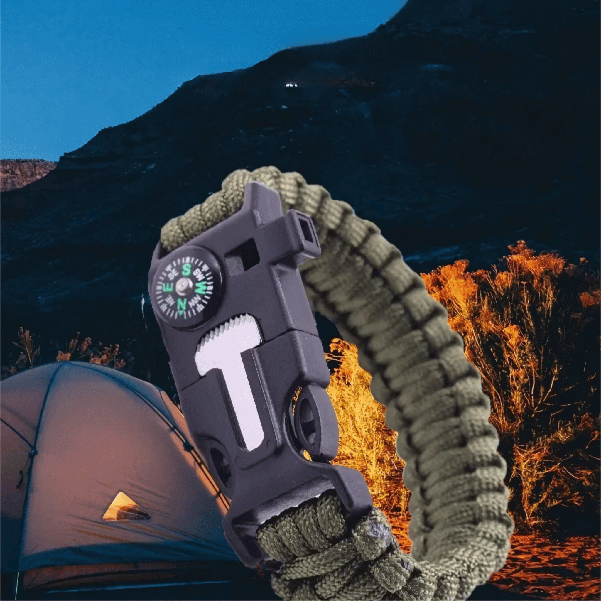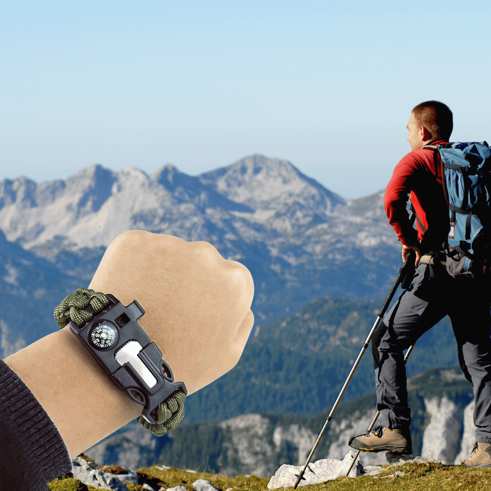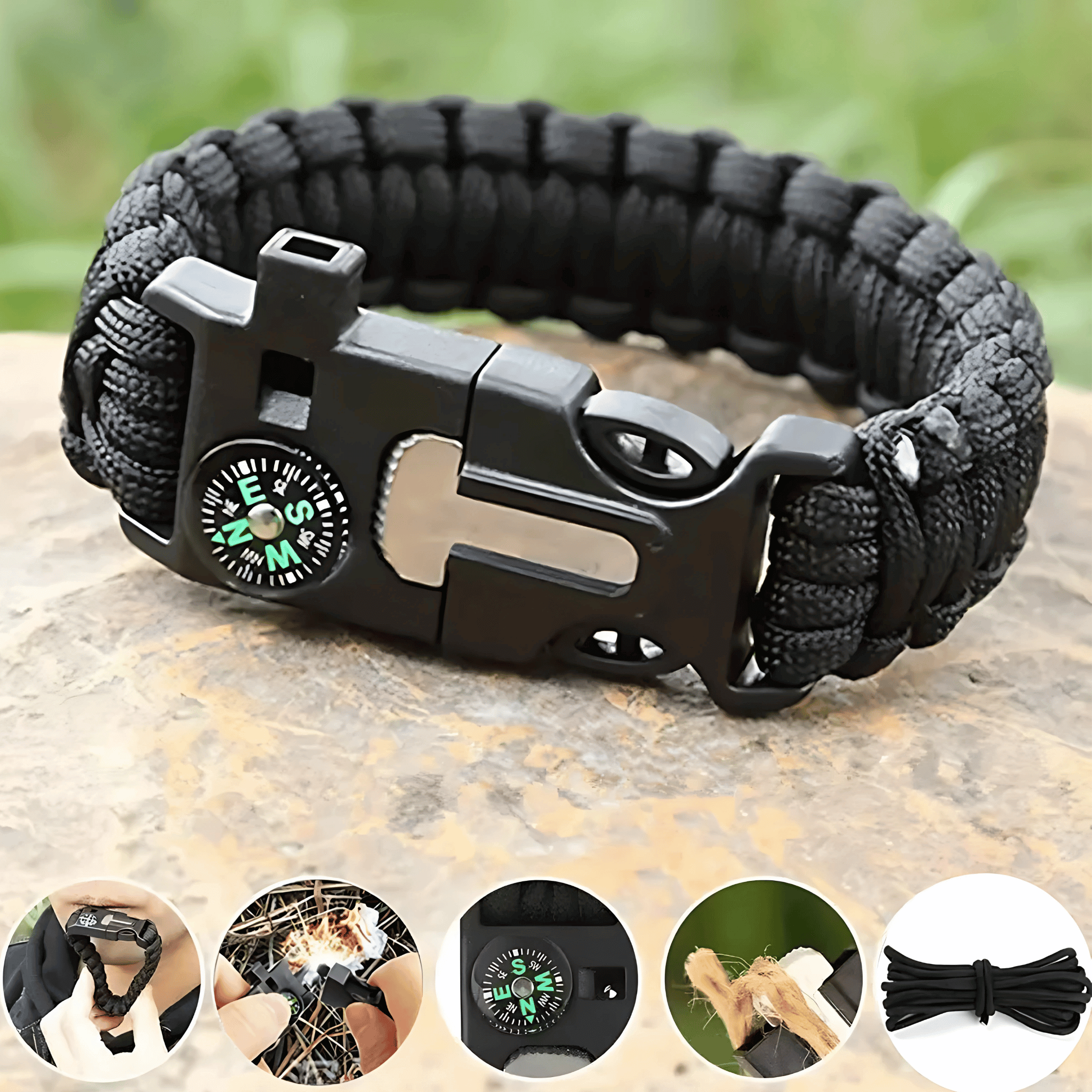 The bracelet combines five practical tools: a rescue cord, compass, fire starter, emergency knife, and signal whistle. This ensures you are prepared for many emergency situations.