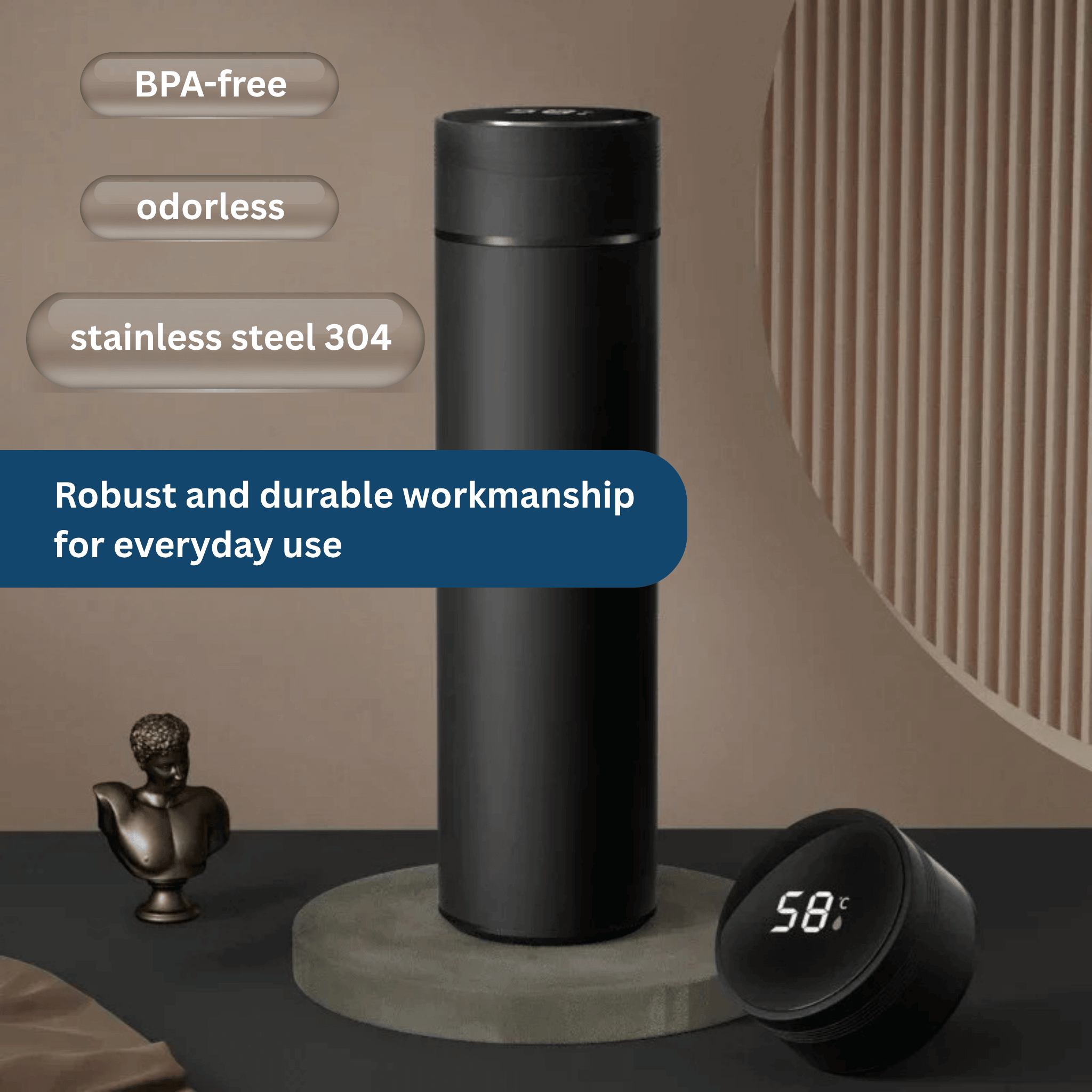 Made from 304 stainless steel, BPA-free, and odorless, the Smart Thermos impresses with its durability and easy cleaning.