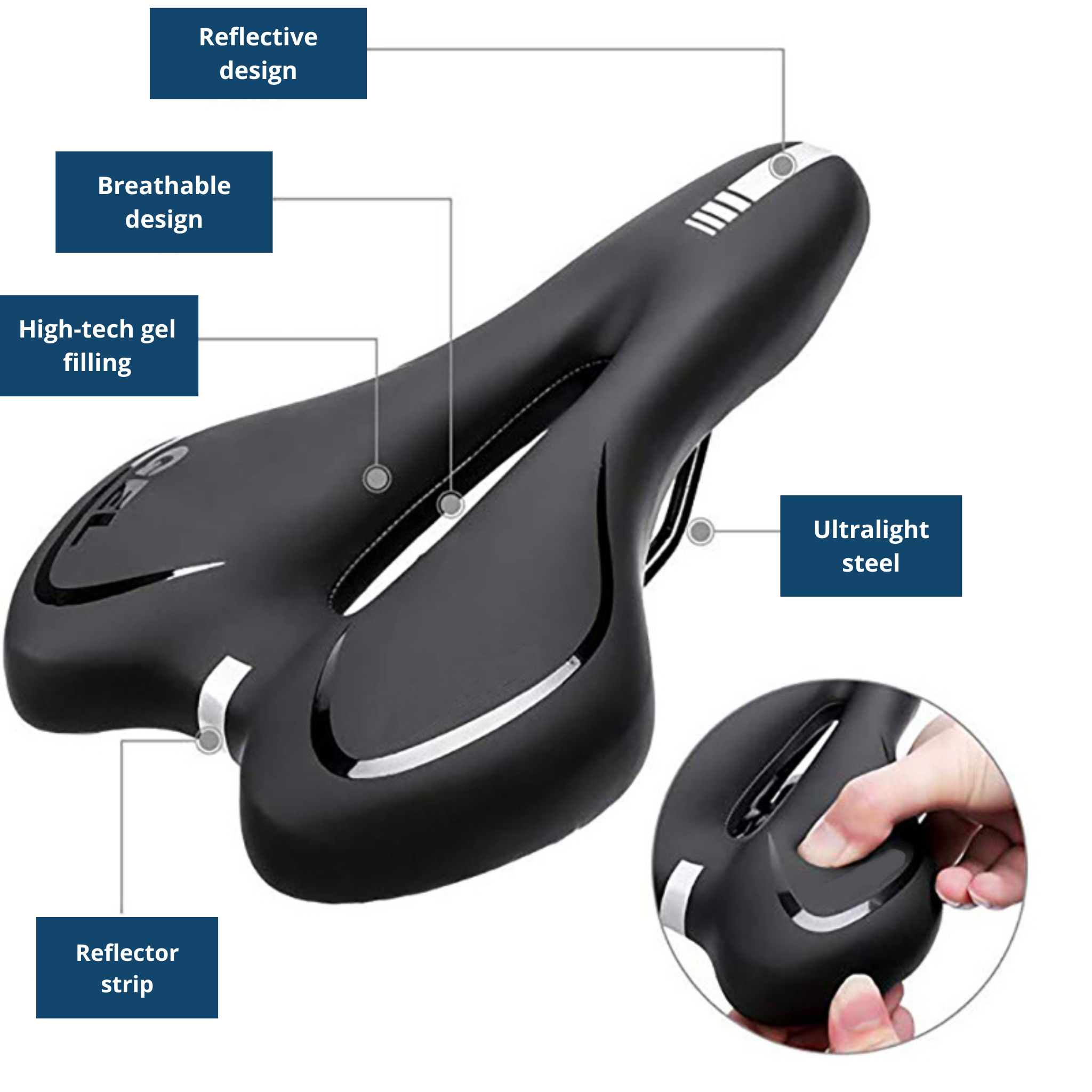 That’s why we’ve equipped the back of our NaturVibes SpeedGel bike saddle with a narrow reflective strip, ensuring that you’re immediately visible to other road users.