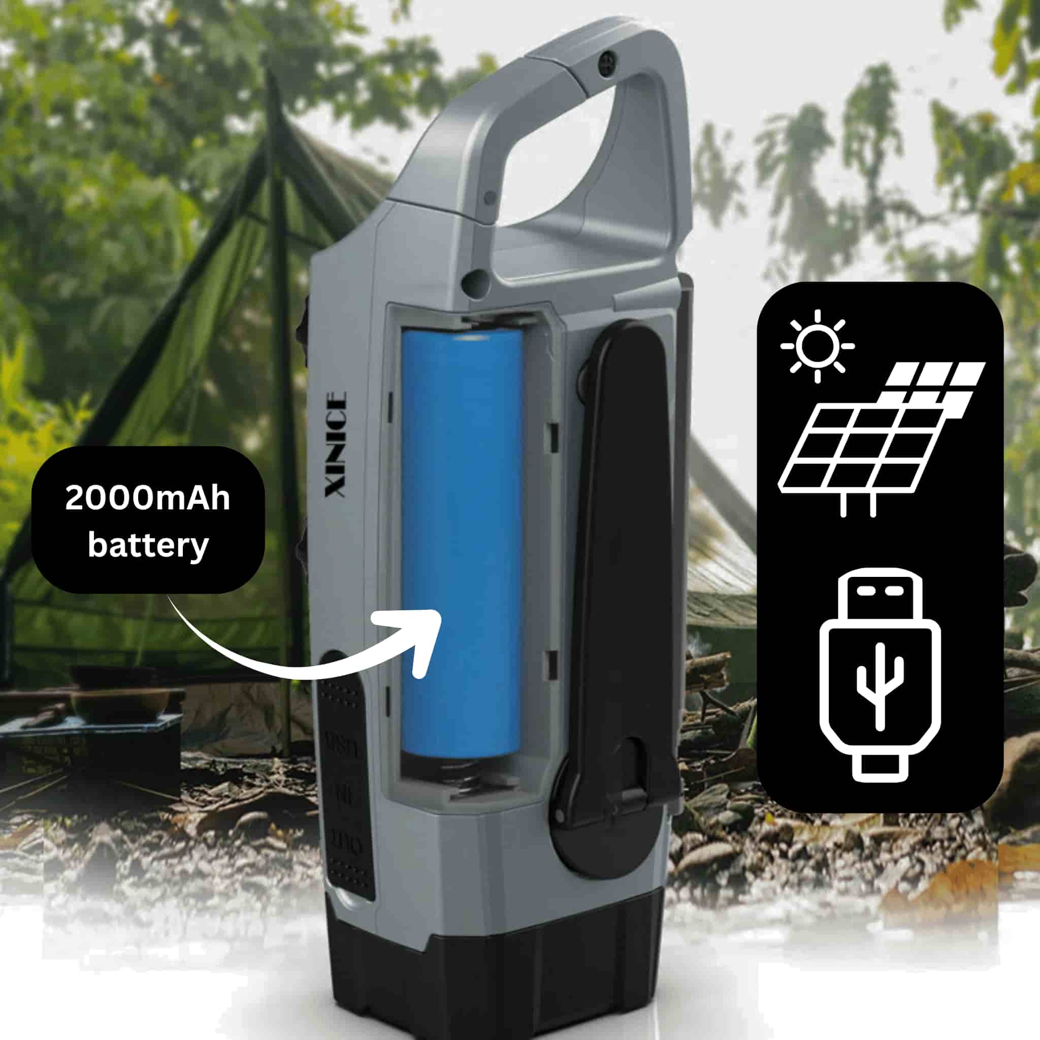 The powerful 2000mAh battery can be charged via USB, solar, or hand crank, keeping you independent from outlets.
