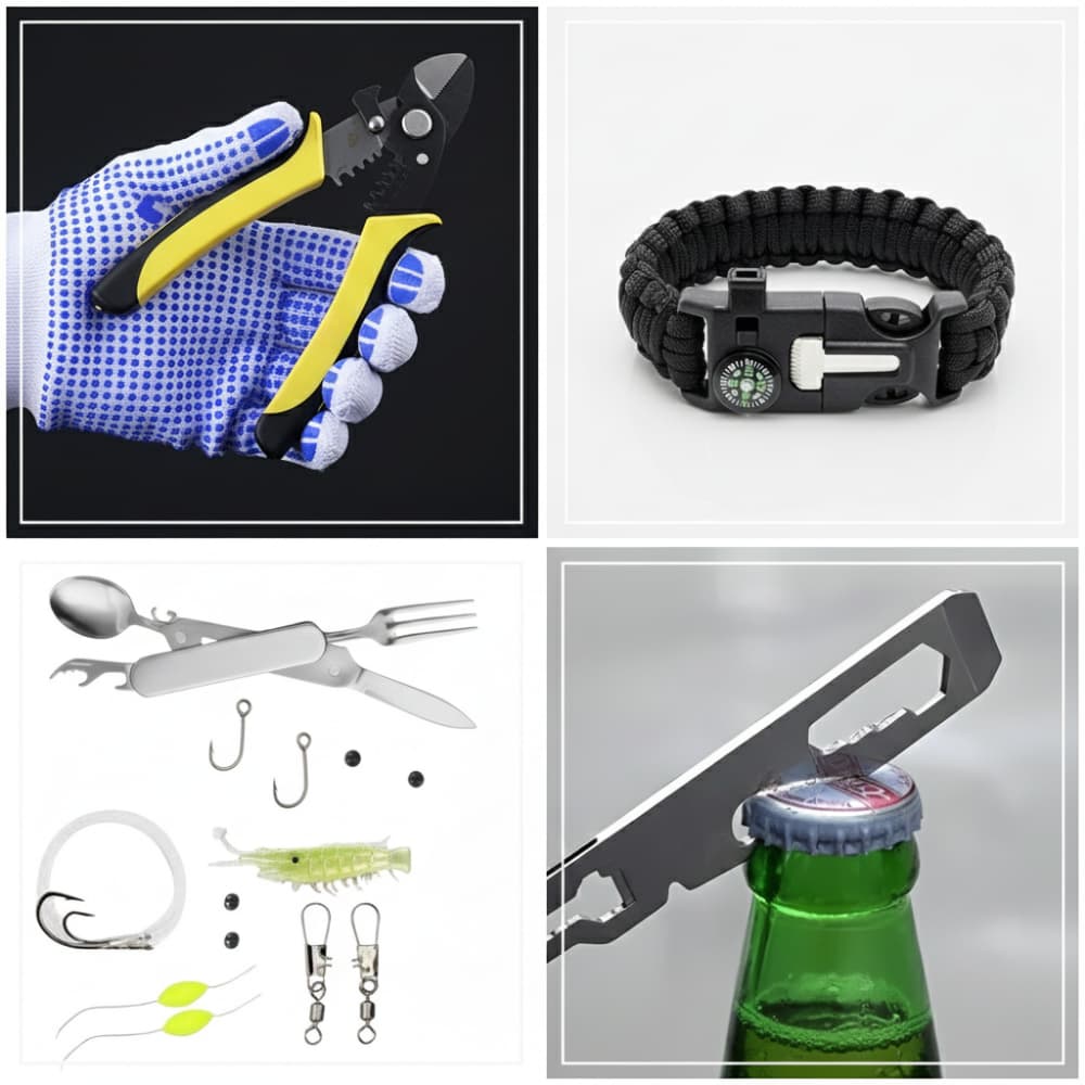 Many of the practical items included—such as the multifunctional cutlery, paracord bracelet, gloves, or fishing gear—are also extremely useful in everyday life, as well as for camping, hiking, and short outdoor trips.