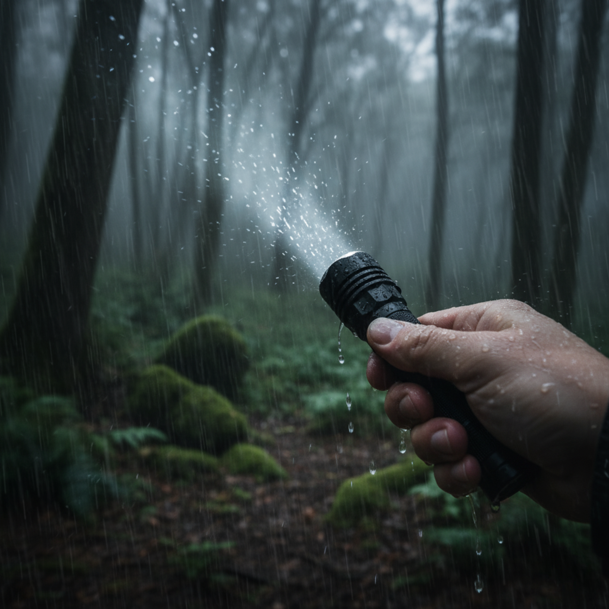The LED flashlight provides bright, adjustable light for paths or repairs.