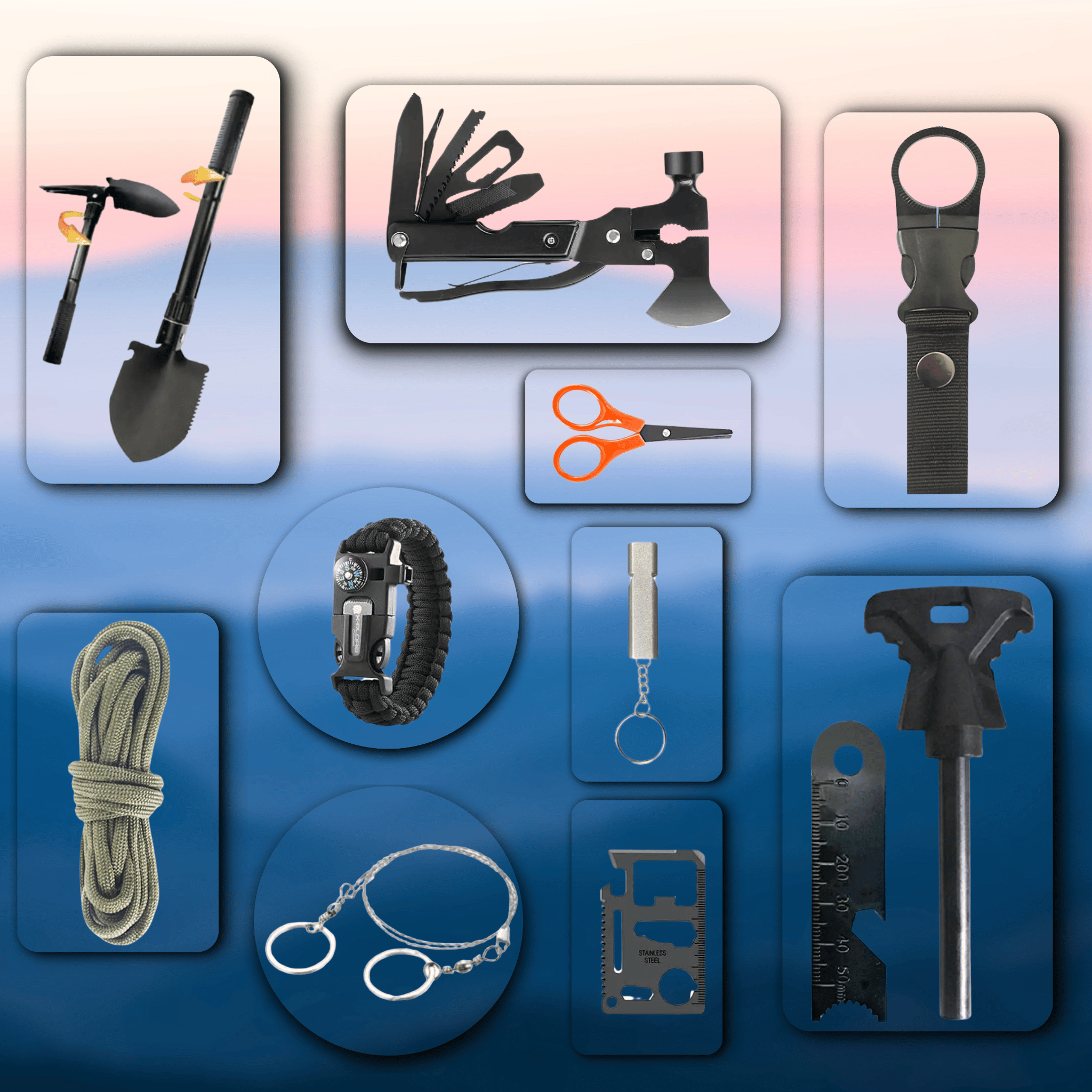 Included are a multitool with pliers, knife, and saw, an ultra-strong flashlight, fire starter, emergency blanket, compass, and a complete fishing kit.