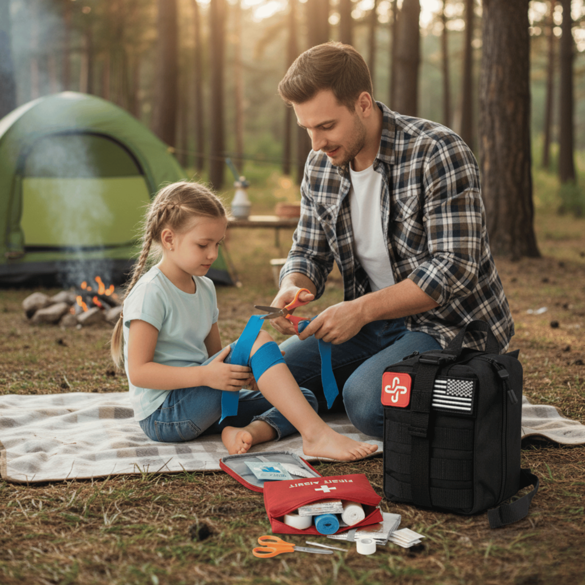The first aid kit with bandages, rescue blanket, scissors, and tape is also neatly arranged.