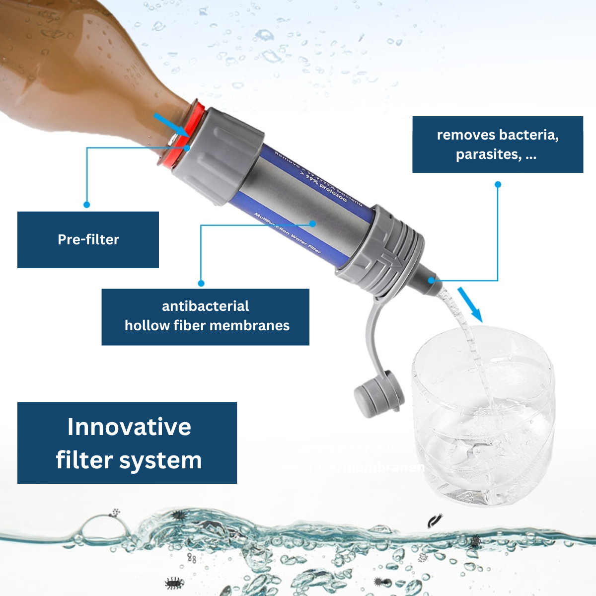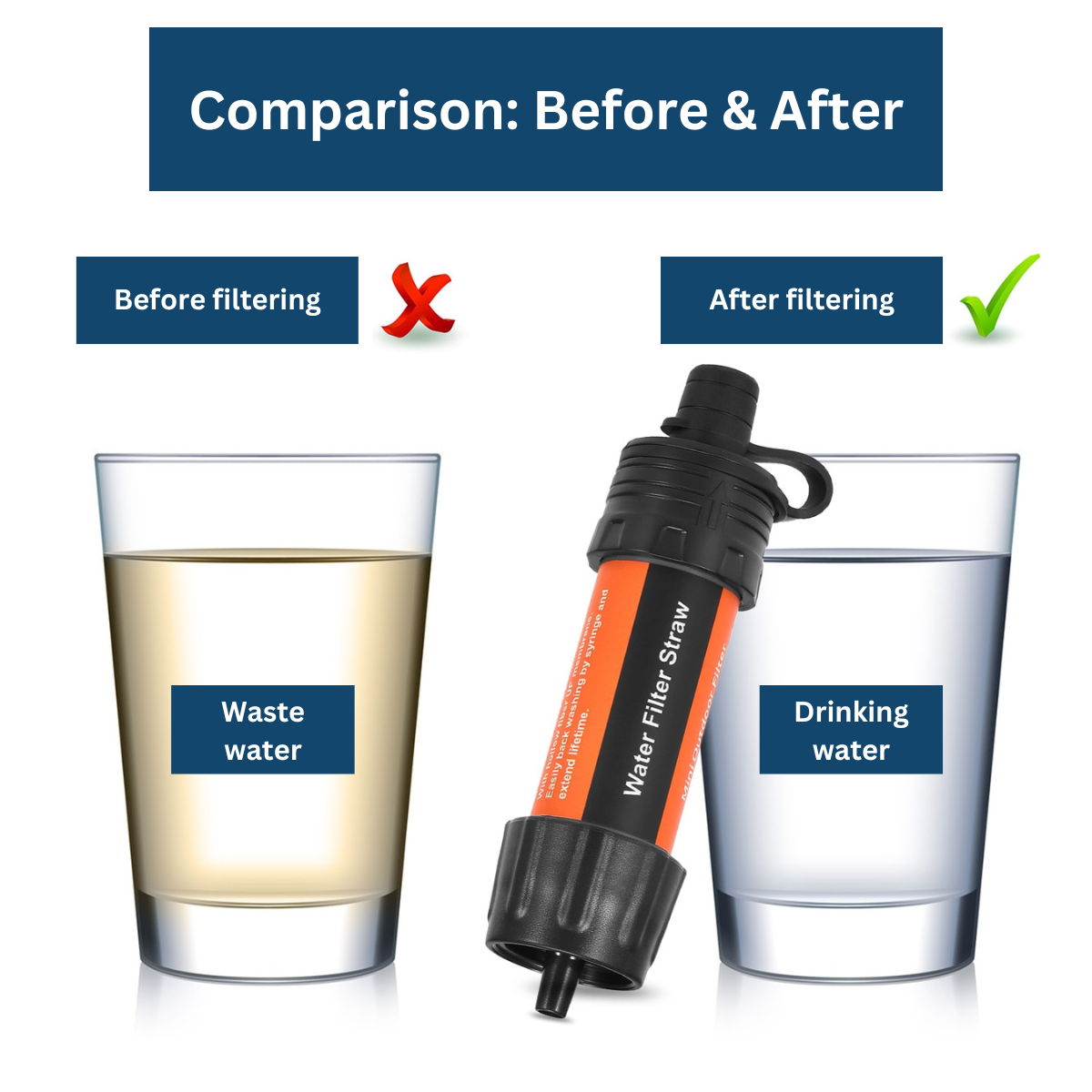 With our NaturVibes Water Filter PRO, you can turn any water, whether from a lake, river, or puddle, into clean and drinkable water.